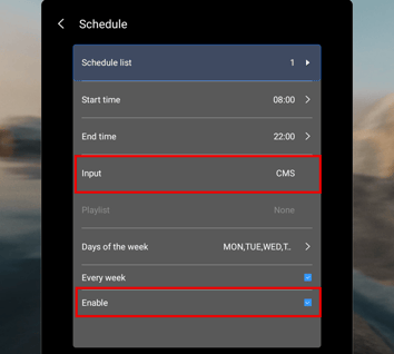 Wichtig (ACHTUNG): Stellen Sie im Bereich „Input“ unbedingt „CMS“ ein, da dies die Quelle für die Medienwiedergabe ist.